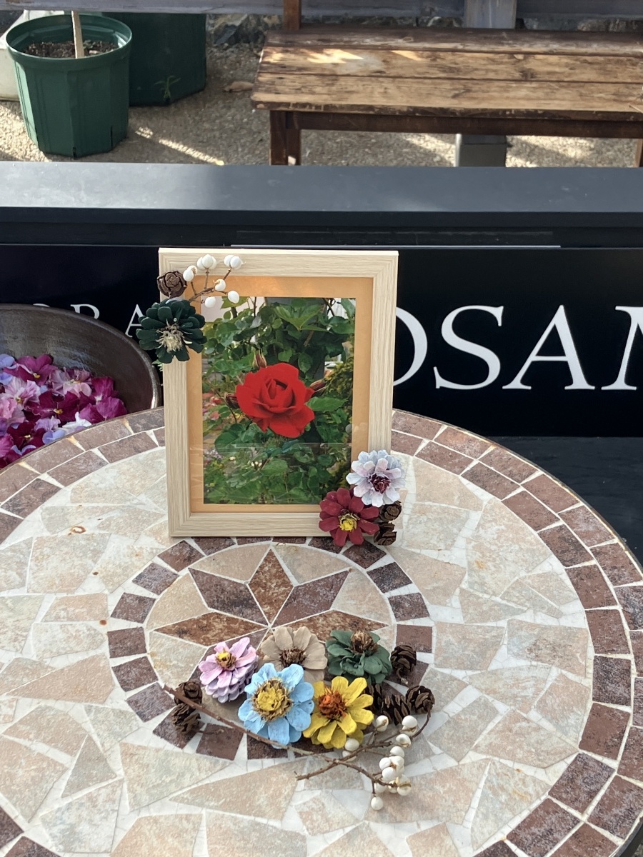 3月1日(日)のマルシェワークショップでは、 木の実を使ったデコレーション~松ぼっくりでお花をつくろう~ のワークショップを開催いたします。 松ぼっくりをかわいいお花に変身さて、世界に一つだけのデコレーションフレームを作りませんか? お気に入りの写真を飾るたびに、ほっこり優しい気持ちになれるフォトフレームです。