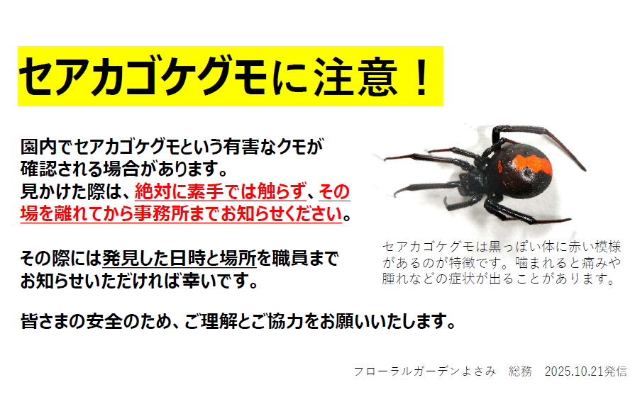 園内でのセアカゴケグモの発生にご注意ください。