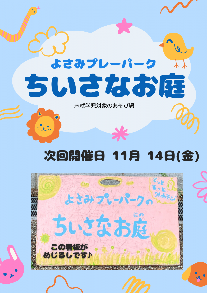 ちいさなお庭 開催日のお知らせです。 11月14日(金)10:30~14:00 未就学児のあそび場、申込不要でご参加いただけます♪