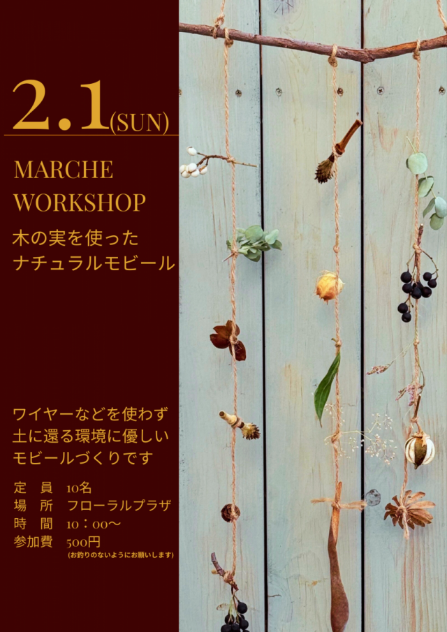 2月1日(日)のマルシェでは、【木の実を使ったナチュラルモビールづくり】のワークショップを開催します! 土に還る材料で作った環境に優しい素敵なモビールを作りませんか? みなさまのご参加、お待ちしております★