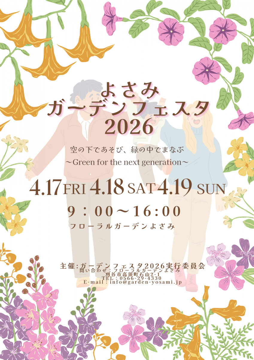【開催予告】 よさみガーデンフェスタ2026 空の下であそび、緑の中でまなぶ ~Green for the next generation~ 日時:4月17日(金)~19日(日) 9:00~16:00 マルシェ・ワークショップ・トークイベント・ステージイベントなど 親子で楽しめるイベントが目白押し! 詳細はインスタグラム・公式HPで順次お知らせします。 今後の発信もお楽しみに♪