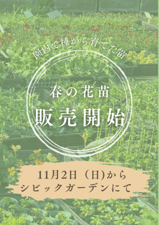 11月2日(日)より、シビックガーデンにて春の花苗販売を開始いたします。 当園にて種から育てた苗になります。 ぜひ、ご利用下さい!