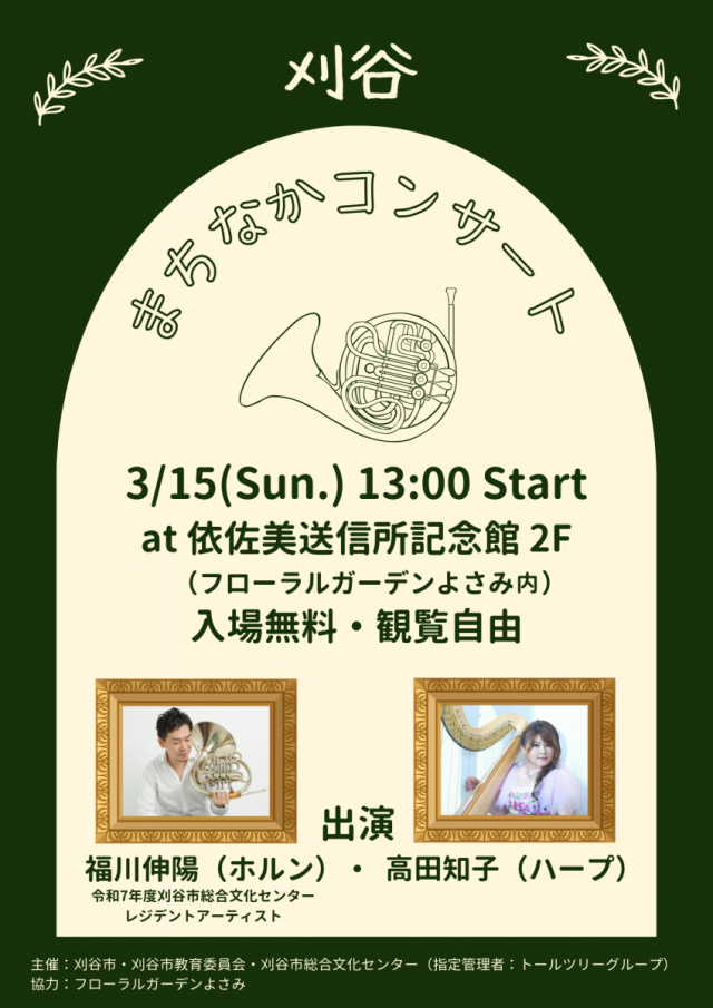 令和8年3月15日(日)13:00より、依佐美送信所記念館2階で、かりや まちなかコンサートが開催されます。 歴史ある記念館の落ち着いた雰囲気の中で、心地良い音楽をお楽しみいただけるイベントとなっております。 ぜひお越しいただき、素敵な音楽をお楽しみください。 みなさまのお越しをお待ちしております!