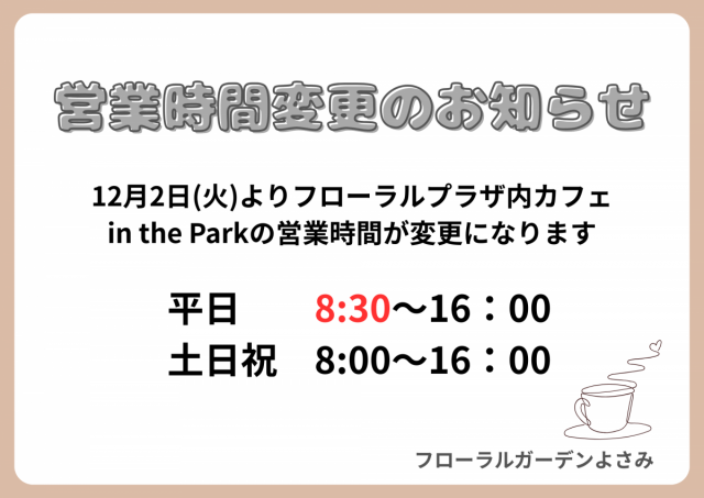 令和7年12月2日(火)より、フローラルプラザ内カフェ in the Park の平日の営業時間が変更になります。 平日の営業時間が、現在8:00~16:00のところ、8:30~16:00へと変更になります。 ご承知おきの程よろしくお願い致します。 なお土日祝日の営業時間は、これまで通り8:00~16:00となります。 みなさまのご利用お待ちしております☕